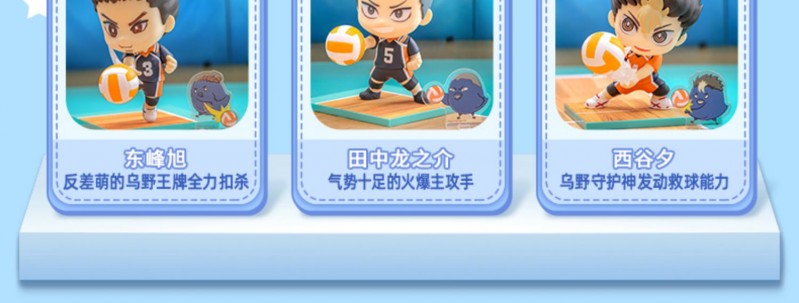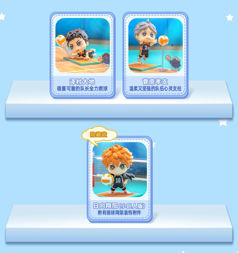 隐藏款:日向翔阳(小巨人版),附有排球网架装饰附件,完美重现排球场上的热血情节!日向左手叉腰,右手持球,身上披着排球部外套犹如王者斗篷随风飘扬,展现出乌野高中「小巨人」的自信!